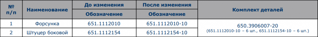 Примечание: на двигателях семейства ЯМЗ-650 взамен форсунки 651.1112010, применяется форсунка 651.1112010-10. При выходе из строя одной форсунки 651.1112010 и не возможности найти на рынке аналогичную, необходимо заменить все шесть (комплект) форсунок 651.1112010-10 совместно со штуцером 651.1112154-10, при этом перепрограммирование ЭБУ не требуется, см. таблицу 1.